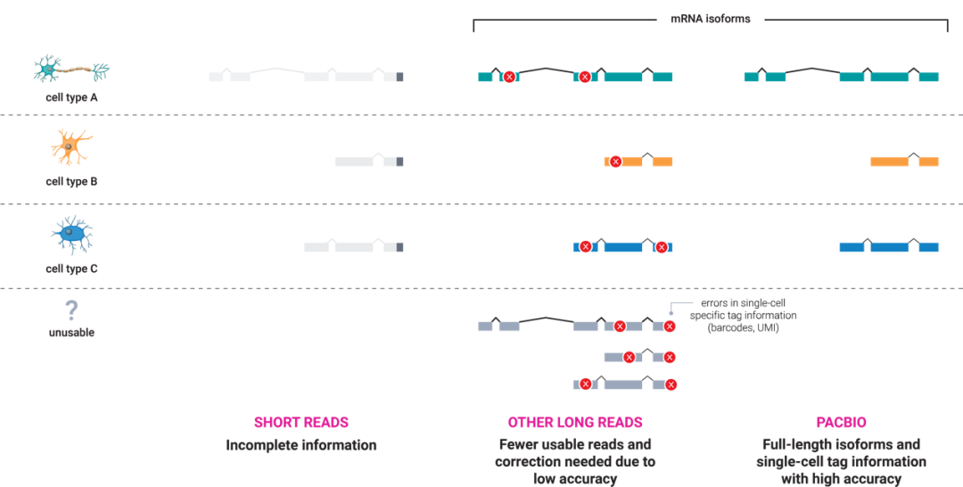 单细胞 RNA 测序(scRNA-Seq)能够表征源自复杂组织的单个细胞之间的基因表达差异,提供比传统 RNA-Seq 更高分辨率的信息。目前,绝大部分的单细胞 RNA 测序都是基于 NGS 测序平台完成的,由于 NGS 测序读长短的原因,转录本均需要片段化后进行测序,只能得到转录本的各端的信息,得到的测序数据只能提供细胞内基因水平的表达信息,缺少可能对疾病或生物功能发挥十分关键作用的重要异构体多样性等信息。为解决以上问题,PacBio 推出了 MAS-Seq试剂盒,通过将短的 cDNA 进行串联建库的方式连接起来再进行HiFi测序,从而解决了长读长单细胞 RNA 测序的通量瓶颈。