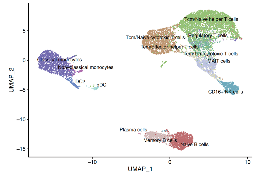 SMRT Link v11.1分析后使用CellTypist获得的Revio-PBMC 2的UMAP细胞聚类。