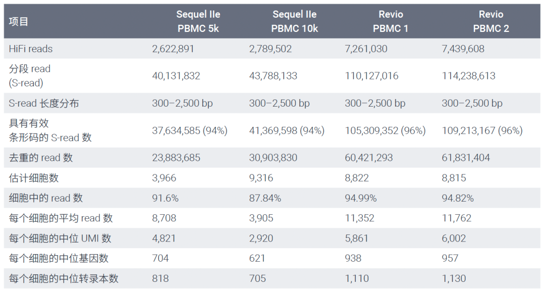 Sequel II/IIe 和 Revio 系统上运行的 PBMC MAS-Seq 文库的 read、细胞和转录本统计数据。