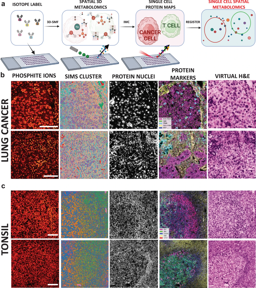 导语 对人体组织进行空间分辨率代谢组学分析,对于研究健康和疾病中的化学平衡和变化至关重要。代谢物和脂质在免疫反应和癌症中发挥着调节作用,尤其是肿瘤中的新陈代谢对了解免疫细胞和癌细胞相互作用的功能变化具有重要作用。免疫细胞类型在渗透到肿瘤生态系统时经历了重要的新陈代谢过程。由于快速增殖过程中营养物质的快速消耗和废物的积累,癌症进展控制着多种免疫细胞和基质细胞类型及其在肿瘤中的代谢功能作用。因此,识别生物组织中的细胞类型及其新陈代谢至关重要。 单细胞测序网讯:12月13日,来自佐治亚理工学院和埃默里大学生物医学工程系的 Ahmet Coskun 和他的合作者在 Nature Communications 杂志上以 “Single-cell spatial metabolomics with cell-type specific protein profiling for tissue systems biology” 为题发表了一篇研究论文,推出了一种新的综合技术——单细胞空间解析代谢(scSpaMet)框架,来分析人体组织,使研究人员能够在三维图像中捕捉分子的位置、结构、运动和功能。 Ahmet Coskun 计划利用 scSpaMet 绘制一幅人体所有免疫细胞的三维化学图谱,以帮助临床医生了解整个免疫系统在不同疾病中的复杂作用。