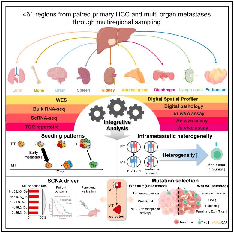 导语 肝细胞癌(简称“肝癌”)是世界上最常见的恶性肿瘤之一,在我国尤为高发,每年新发病例和死亡病例均占全球近一半。手术切除是目前肝癌治疗的首选方式,但70-80%的肝癌病人确诊时已发生肿瘤播散转移,为中晚期肝癌,失去了手术机会;即使手术切除,肝癌术后5年转移复发率高达60-70%。肝癌的转移复发是影响病人长期生存的主要原因,并已成为进一步提高肝癌整体疗效的瓶颈。目前肝癌转移肿瘤的基因突变和分子表达全景图谱仍极度缺乏,肝癌在转移过程中的克隆选择等演化规律尚不清晰,导致肝癌转移病灶的临床诊疗仍然缺乏足够的理论指导。全面深刻认识肝癌转移复发的内在机制,探索更有效的干预新策略,已成为进一步提高肝癌病人总体生存率的关键课题。 单细胞测序网讯:12月14日,复旦大学(附属中山医院)肝癌研究所樊嘉院士团队与上海科技大学张力烨团队及上海顿慧医疗合作,于国际顶尖肿瘤学期刊Cancer Cell在线发表了题为 “Integrated multi-omics profiling to dissect the spatiotemporal evolution of metastatic hepatocellular carcinoma” 的研究成果。本研究整合分析多组学数据,在国际上首次系统刻画了肝癌转移的时空演进全景图谱,揭示了肝癌转移的复杂进化轨迹和克隆选择机制,为研发肝癌转移预测的新标志物和治疗新靶点提供了宝贵的数据和理论基础。