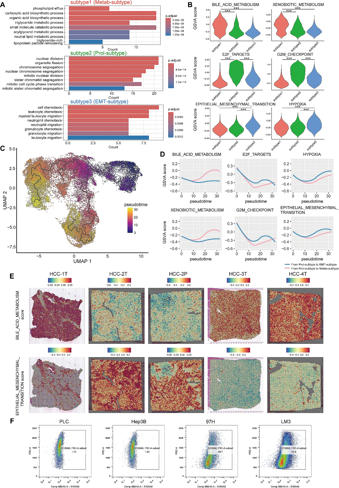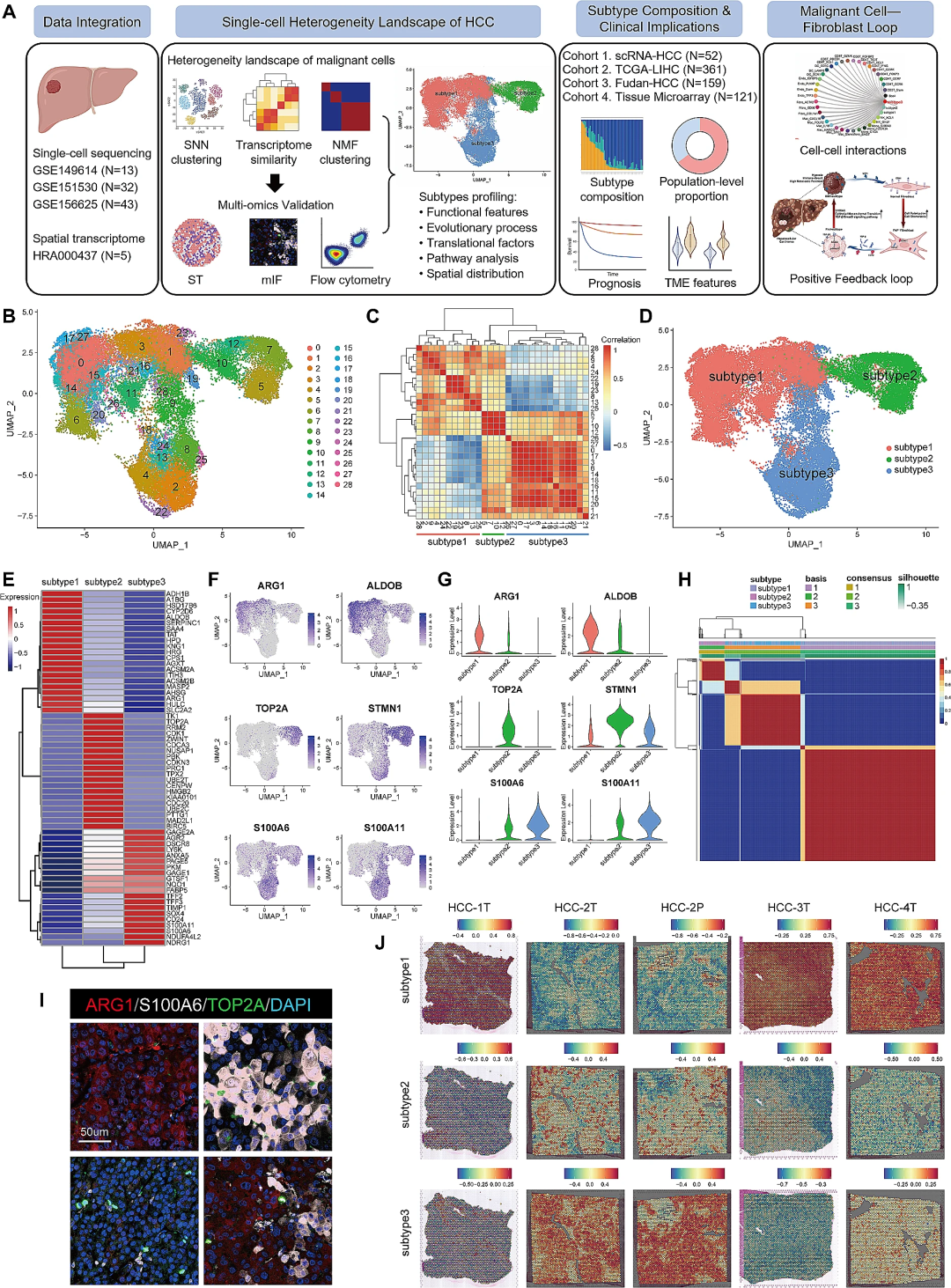 导语 肝细胞癌(HCC)是最常见的原发性肝癌,其高发病率和死亡率给全球健康造成了重大负担。HCC在不同肿瘤间甚至同一肿瘤内复杂多样的分子性质,表现为肿瘤异质性,这对理解促进肿瘤进展和转移的潜在机制提出了巨大挑战。既往研究利用多种组学方法研究了HCC的肿瘤异质性,建立了多个肿瘤亚组分类。然而,由于技术限制,这些异质性分类不能区分肿瘤细胞和肿瘤微环境。虽然有一些研究调查了不同恶性肿瘤的细胞肿瘤异质性,但HCC在单细胞水平上的肿瘤异质性尚不清楚。因此,作者旨在全面定义和描述具有高转移潜力的肿瘤细胞,揭示肿瘤细胞与肿瘤微环境(tTME)相互作用的潜在机制。 单细胞测序网讯:近日,复旦大学附属中山医院黄傲和周俭团队在Molecular Cancer上发表了题为“Single-cell tumor heterogeneity landscape of hepatocellular carcinoma: unraveling the pro-metastatic subtype and its interaction loop with fibroblasts”的研究论文,作者通过整合52个单细胞RNA测序数据和5个空间转录组学数据,建立了HCC恶性细胞的异质性景观。作者在肿瘤细胞中发现了三种亚型,包括Metab亚型、Prol亚型和EMT亚型。富集分析发现,这三种亚型具有代谢、增殖和上皮间质转化的不同特征。通过建立恶性细胞的异质性,作者确定了HCC的三亚型分类。其中,EMT亚型肿瘤细胞在转移中起着至关重要的作用。靶向肿瘤细胞和成纤维细胞之间的反馈回路是一种很有前途的抗转移策略。